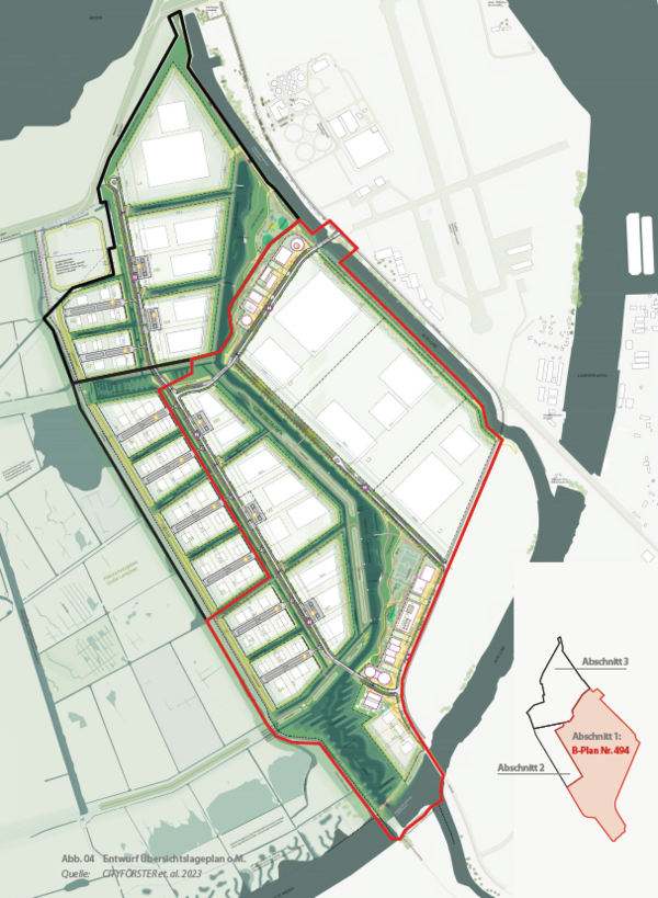 Besonders attraktiv ist die L-Warft mit einer Gesamtfläche von 330.000 m², aufteilbar in drei flexibel nutzbaren Baugrundstücken ab 100.000 m². Die Flächen sind sofort verpachtbar und bieten Gestaltungsspielraum für individuelle Projektentwicklung. Je nach Bedarf kann die L-Warft von einem einzelnen Unternehmen oder von bis zu drei Betrieben genutzt werden. Der Zugang ist aktuell über das erste Baugrundstück gesichert; bei einer Mehrfachvergabe werden zusätzliche Zufahrten geschaffen, sodass eine optimale Erschließung gewährleistet ist.